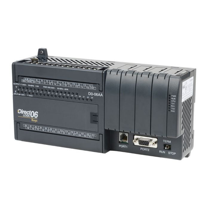 DL06 CPU, 20 AC in / 16 AC out, requires external 110-220 VAC power. Built-in communication ports. Four option slots available.