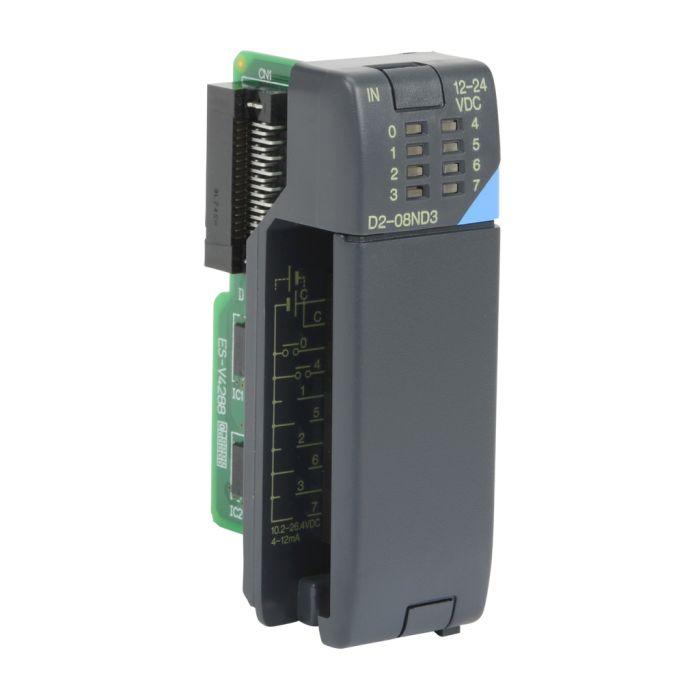 8-point 12-24 VDC current sinking/sourcing input module, 1 common (2 common terminals), removable terminal.