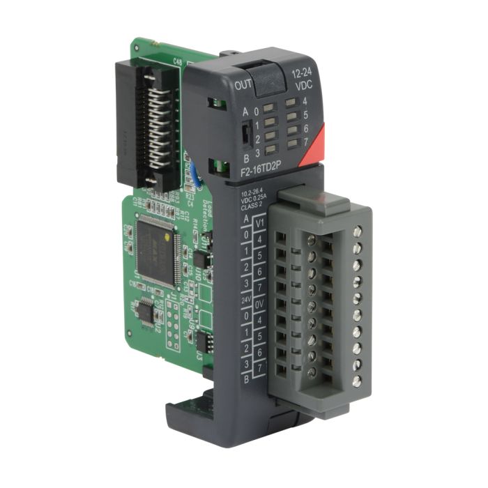 16-point, 12-24 VDC current sourcing output module, 1 common terminal, 0.25A/point continuous, overcurrent trip 0.6A min, 1.2A max.