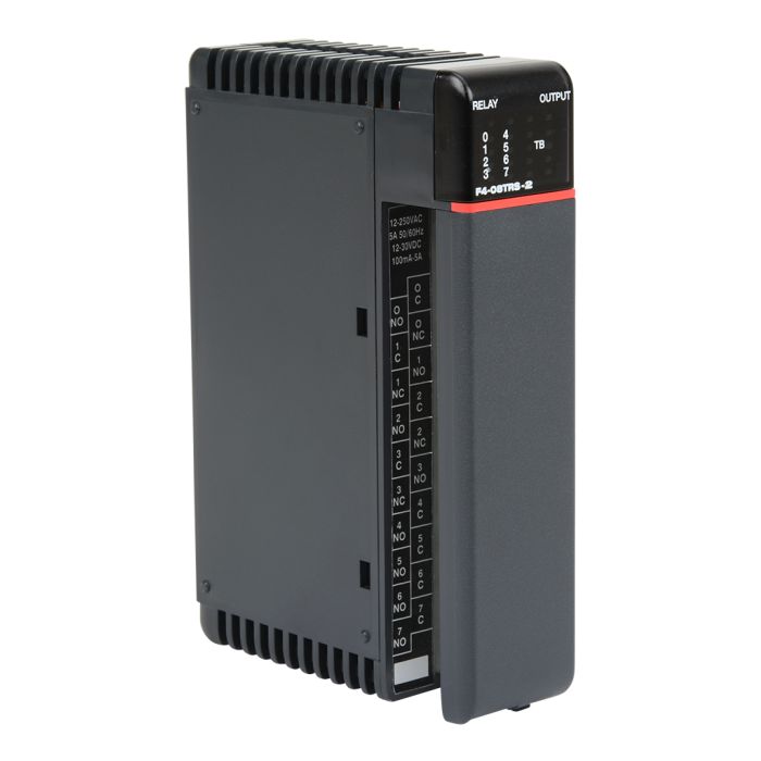 8-point 12-30 VDC or 12-250 VAC isolated output module, 4 Form A (SPST) relays and 4 Form C (SPDT) relays, 5A/point, 40A/module, replaceable fuses.