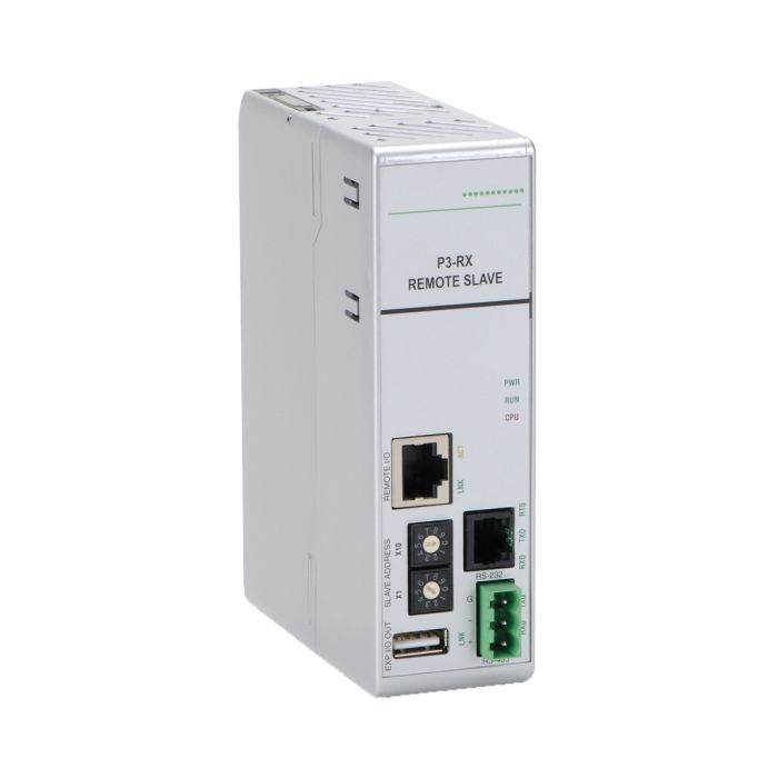 Productivity3000 remote I/O expansion module, RS-232 (RJ12) port, RS-485 (3-wire terminal block) port, Ethernet (RJ45) port, USB A port.