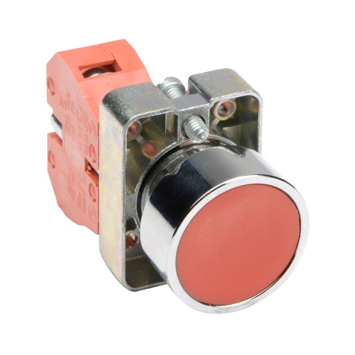 Pushbutton, 22mm, momentary, 1 N.C. contact(s), metal base, metal bezel, Operator: red, flush, 30mm, round, plastic.