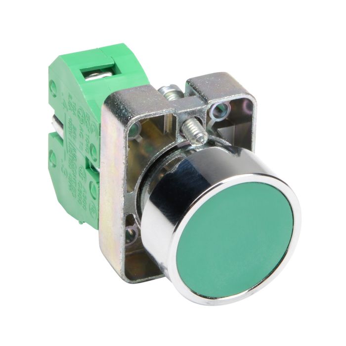 Pushbutton, 22mm, momentary, 1 N.O. contact(s), metal base, metal bezel, Operator: green, flush, 30mm, round, plastic.
