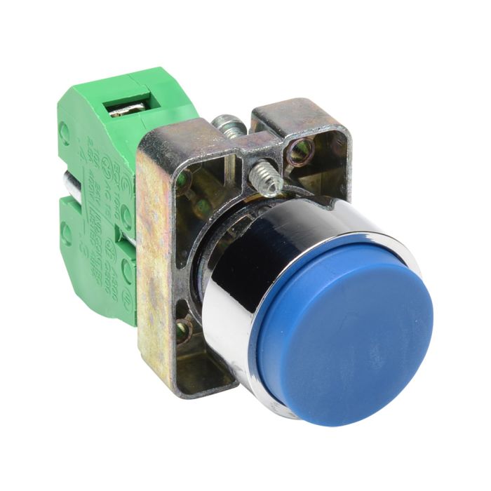 Pushbutton, 22mm, momentary, 1 N.O. contact(s), metal base, metal bezel, Operator: blue, extended, 30mm, round, plastic.