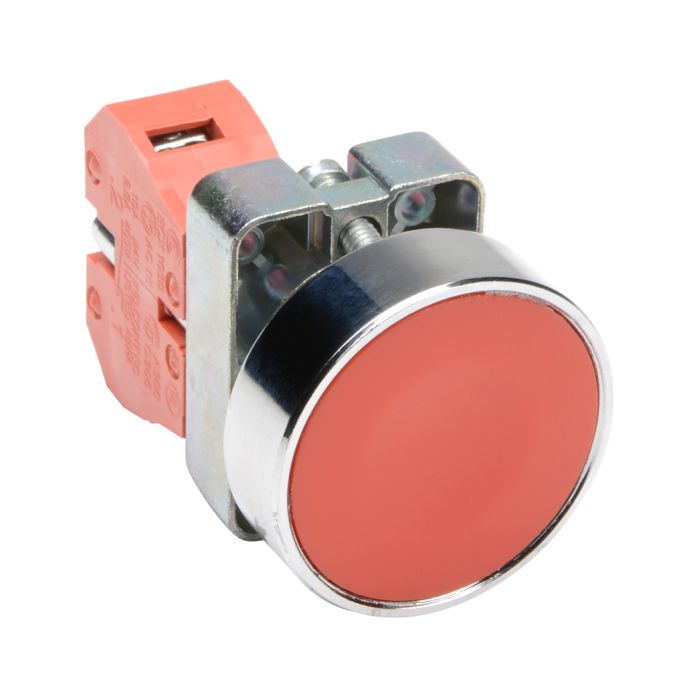 Pushbutton, 22mm, momentary, 1 N.C. contact(s), metal base, metal bezel, Operator: red, flush, 40mm, round, plastic.