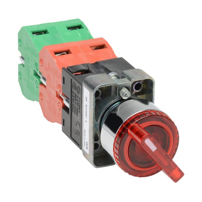 Selector switch, 22 mm, 3-position, maintained, LED illuminated, 2 N.C./2 N.O. contact(s), metal bezel, Operator: red, knob, 30 mm, round, plastic, 24 VAC/DC, full voltage.