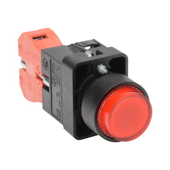 Pushbutton, 22mm, momentary, incandescent illuminated, 1 N.C. contact(s), plastic base, plastic bezel, Operator: red, extended, 30mm, round, plastic, 24V, full voltage.