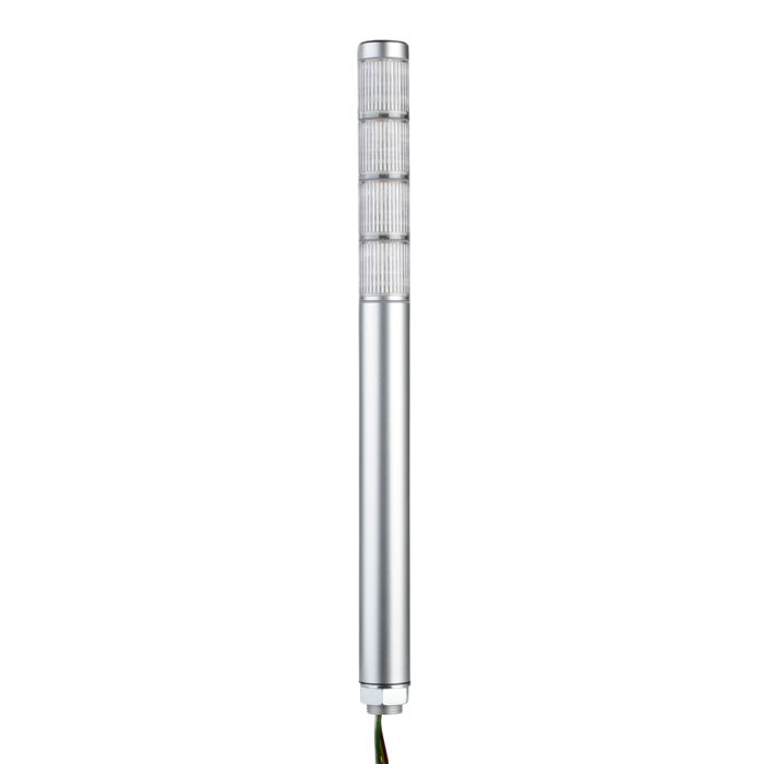 Patlite signal tower, 4 tiers, 30mm diameter, red, amber, green and blue LED module(s), continuous light function, 24 VAC/VDC, NPN/PNP polarity, clear lens, IP65, 220mm body length, silver.