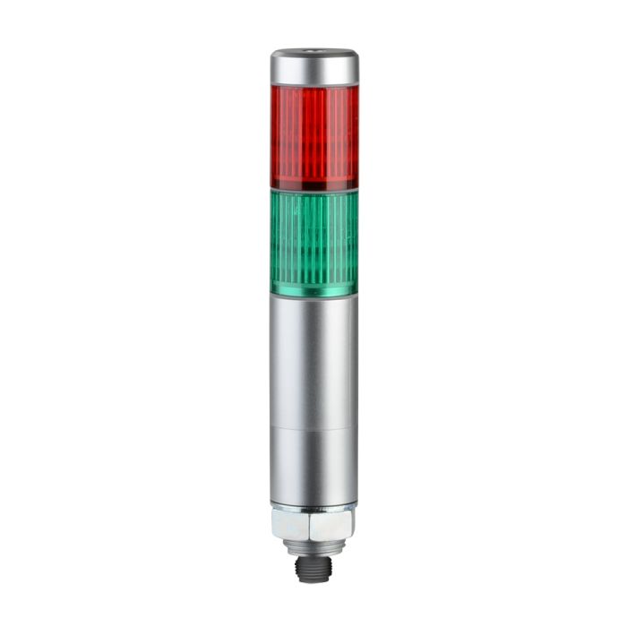 Patlite signal tower, 2 tiers, 30mm diameter, red and green LED module(s), continuous light function, 24 VDC, NPN/PNP polarity, colored lens, IP65, 68mm body length, silver.