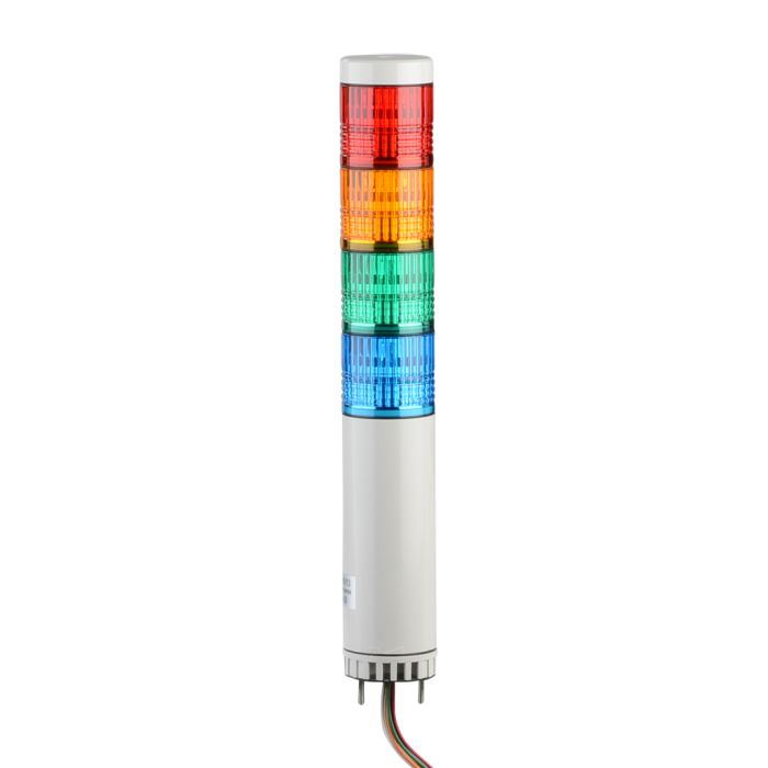 Patlite signal tower, 4 tiers, 40mm diameter, red, amber, green and blue LED module(s), continuous light function, 24 VAC/VDC, NPN/PNP polarity, colored lens, IP65, 111mm body length, ivory.