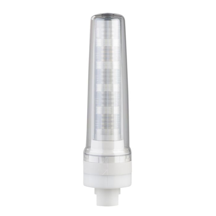 Patlite signal tower, 3 tiers, 70mm diameter, red, amber and green LED module(s), continuous light function, 24 VDC, NPN/PNP polarity, clear lens, IP69K, 230mm body length, off-white.