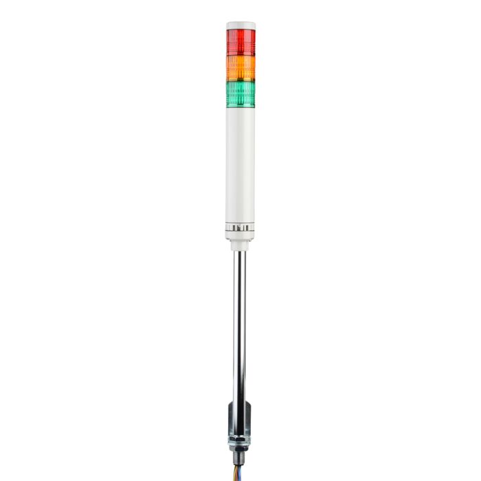 Patlite signal tower, 3 tiers, 40mm diameter, red, amber and green LED module(s), continuous or flashing (60 fpm +/- 12 fpm) light function, 2 alarms, 90 - 250 VAC, NPN polarity, colored lens, IP54, 167mm body length, ivory.