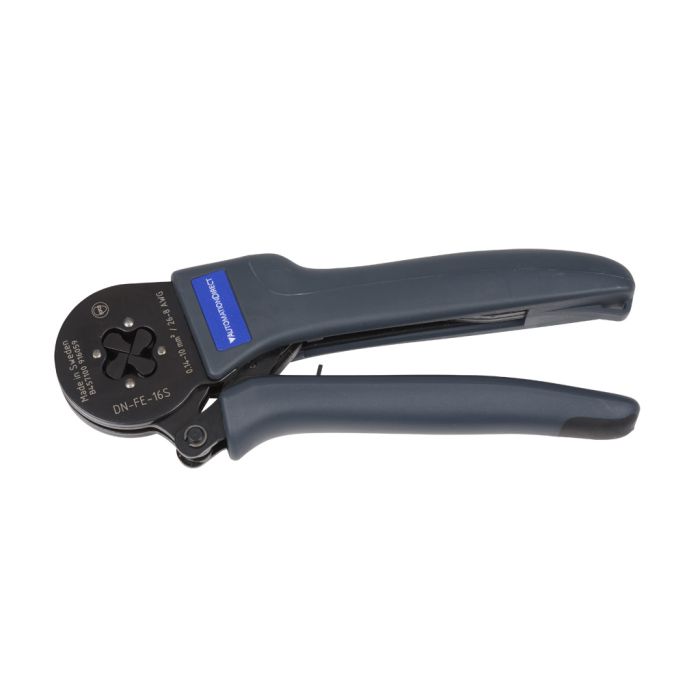 Wire crimping tool, self-adjusting, square profile, 26 to 8 AWG capacity. For use with insulated and non-insulated wire ferrules.