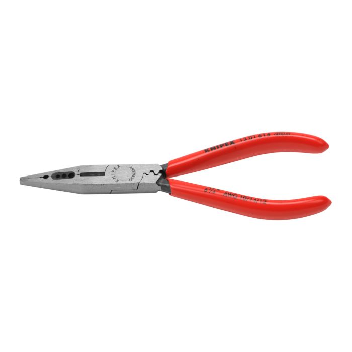 KNIPEX electricians pliers, for gripping, bending, cutting and stripping wire and crimping end sleeves, 6-1/4in overall length, serrated gripping surface, beveled cutting edges, stripping 10, 12 and 14 AWG capacity, plastic coated handles.