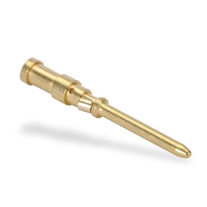Machined crimp contact, male, 10 amp, 18AWG (0.75 mm sq.), gold-plated copper alloy. 100 contacts per package.