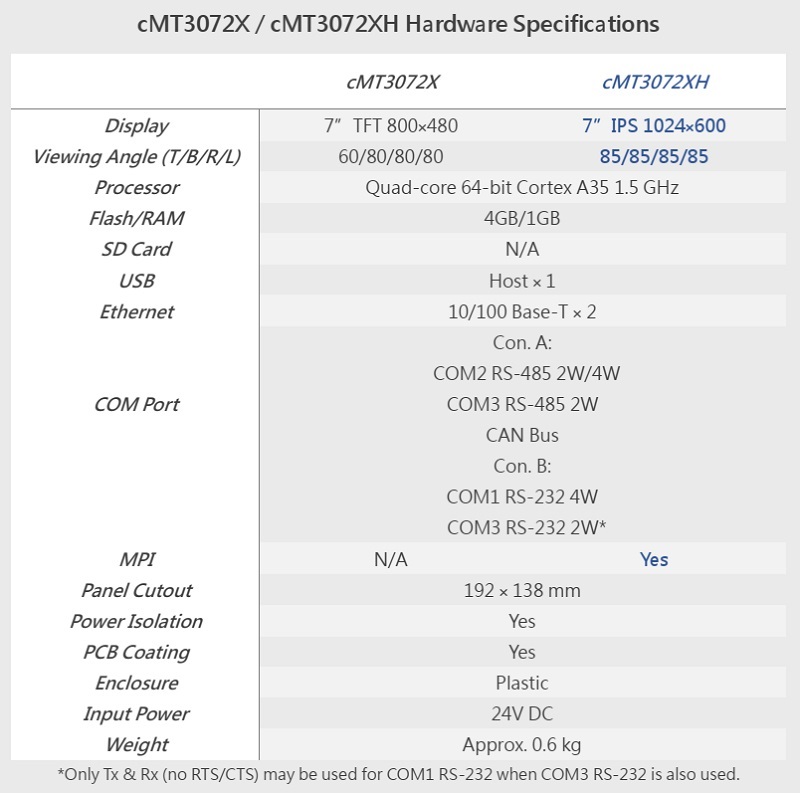 A key difference between the cMT3072XH and cMT3072X is that cMT3072XH uses a high-quality IPS LCD with higher resolution (1024 x 600), providing a richer visual experience, additionally, the cMT3072XH supports MPI communication interface.