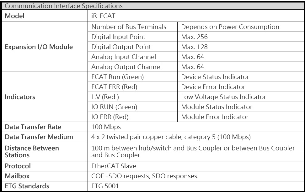 iR-ECAT can be connected to miscellaneous iR Series modules suitable for the application. With Weintek’s ibus technology, the response speed of iR Series I/O modules is ensured to be comparable with EtherCAT’s efficiency.