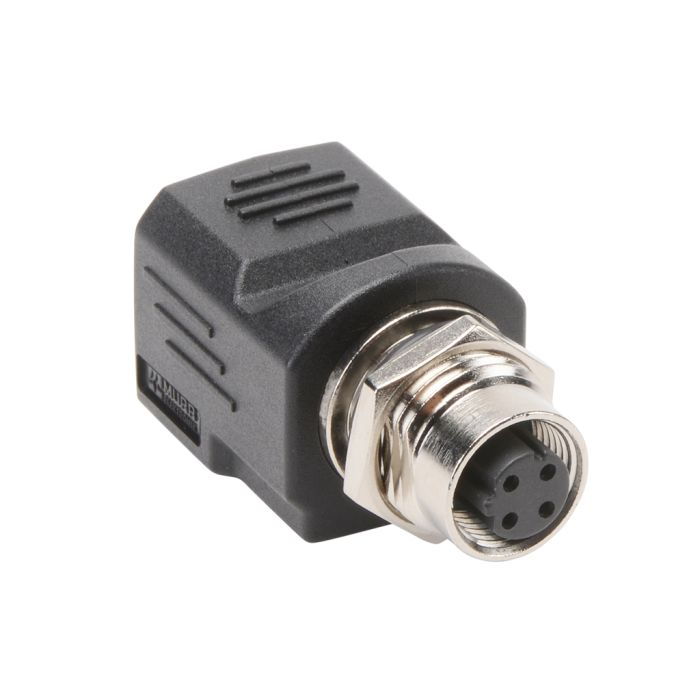 Field wireable Ethernet connector, M12 D-coded female 4-pole to RJ45 female Ethernet axial, M12-IP68, RJ45-IP20. Mounting nut(s) included. Exceeds Category 5E specifications.
