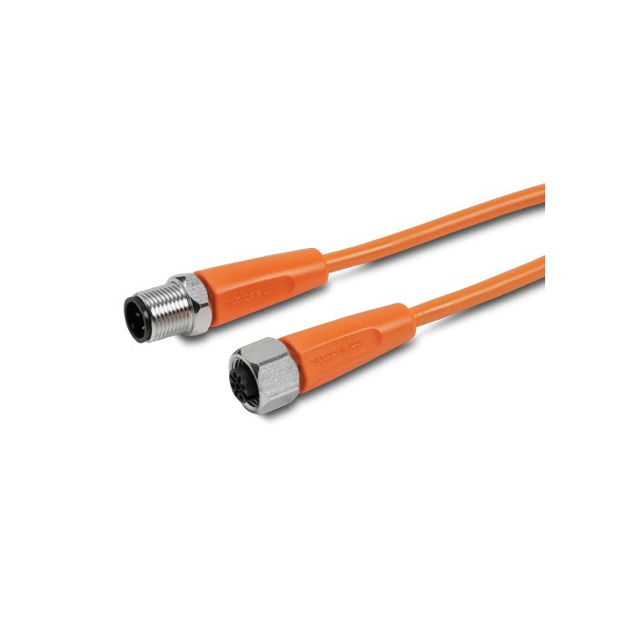 M12 patch cable for quick-disconnect sensors, 12mm axial female to axial male, 4-pole, stainless steel connection, orange PVC outer jacket, 0.6 meter.