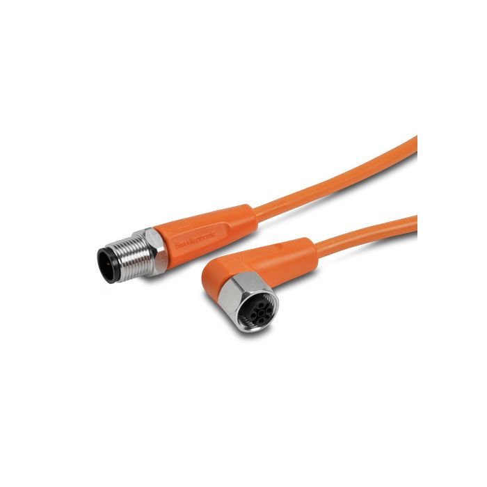M12 patch cable for quick-disconnect sensors, 12mm right-angle female to axial male, 4-pole, stainless steel connection, orange PVC outer jacket, 1 meter.