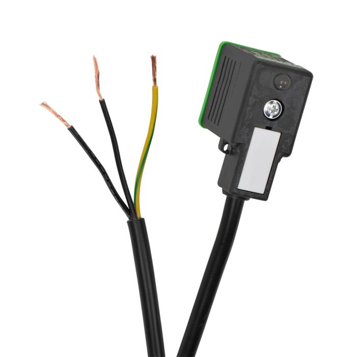 Solenoid valve cable 10mm DIN 43650 Form B molded connector to 3-wire pigtail, 24 VDC, 18 AWG, PVC jacket, 16.4ft/5m cable length, surge protection, LED indication.