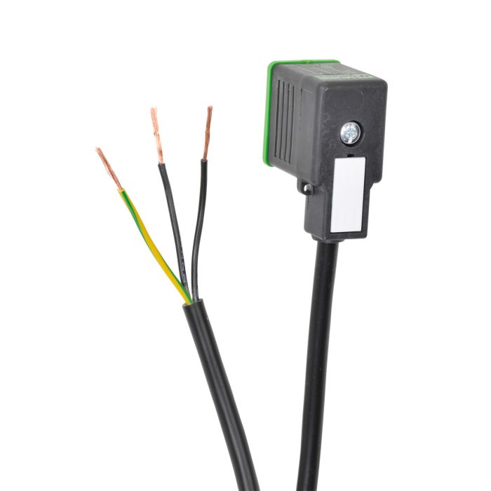 Solenoid valve cable 11mm DIN style molded connector to 3-wire pigtail, 230 VAC/VDC, 18 AWG, PVC jacket, 16.4ft/5m cable length.
