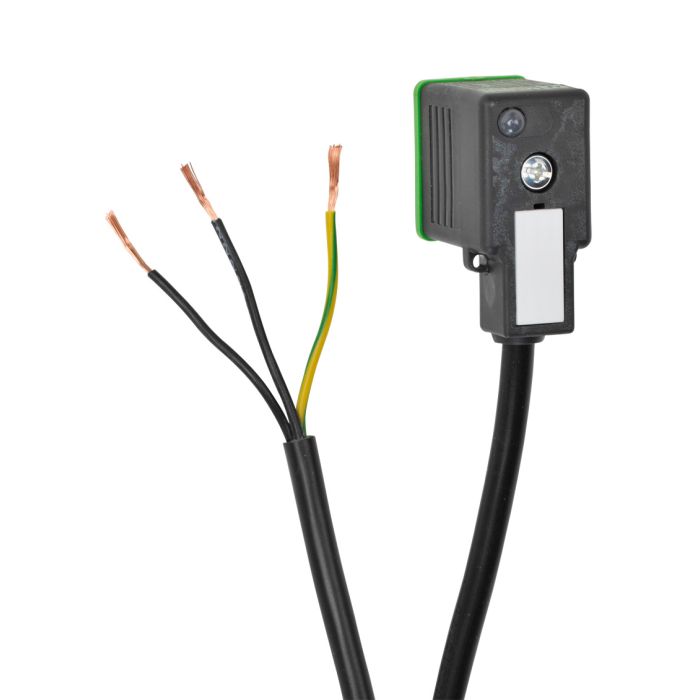Solenoid valve cable 11mm reverse DIN style molded connector to 3-wire pigtail, 24 VDC, 18 AWG, PVC jacket, 9.8ft/3m cable length, surge protection, LED indication.