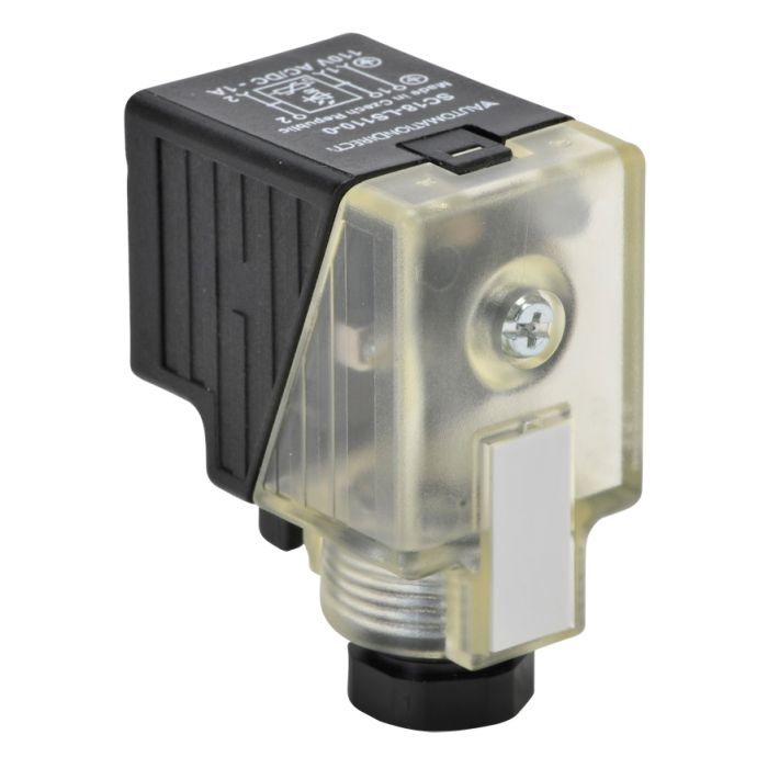 Field wireable solenoid valve connector 18mm DIN 43650 Form A molded connector to PG9 cable gland, 110 VAC, surge protection, LED indication.