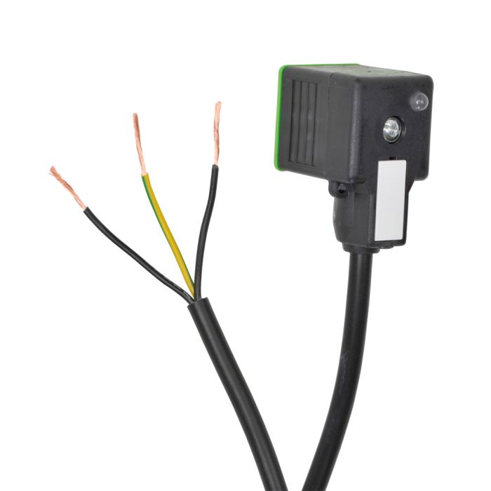 Solenoid valve cable 18mm DIN 43650 Form A molded connector to 3-wire pigtail, 24 VDC, 18 AWG, PVC jacket, 9.8ft/3m cable length, surge protection, LED indication.