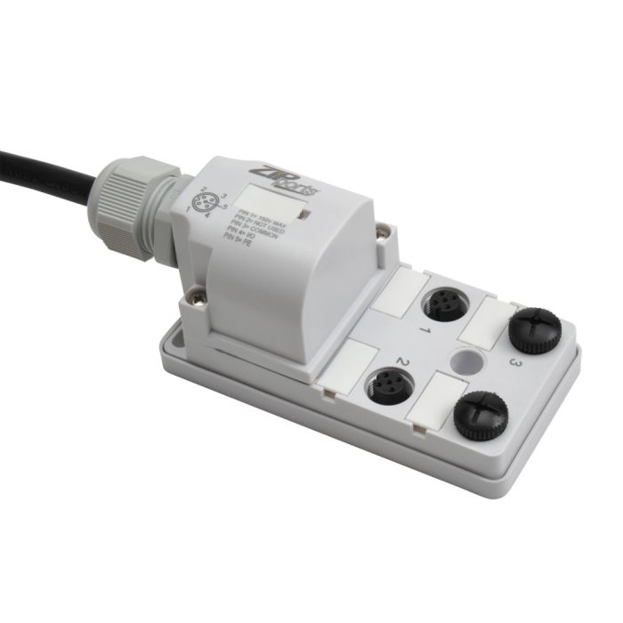 ZIPport junction block, 4 ports with M12 sockets rated 150 VAC/DC max and 3 amps each, 4-pin with (1) I/O per socket, no LED , 5-meter cable.