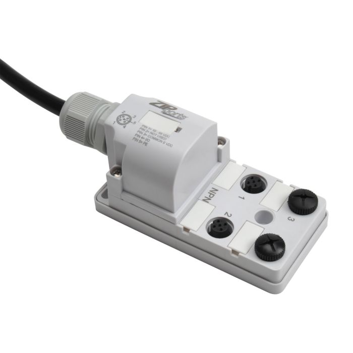 ZIPport junction block, 4 ports with M12 sockets rated 48 VDC max and 3 amps each, 4-pin with (1) I/O per socket, power and NPN LED , 5-meter cable.