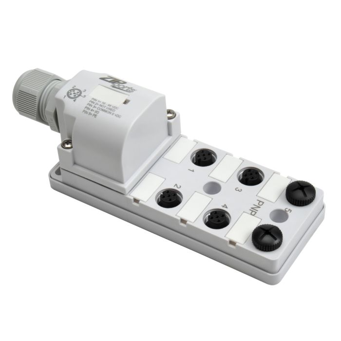 ZIPport junction block, 6 ports with M12 sockets rated 48 VDC max and 3 amps each, 4-pin with (1) I/O per socket, power and PNP LED , field wired connection.