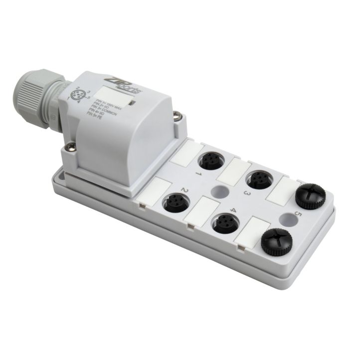 ZIPport junction block, 6 ports with M12 sockets rated 150 VAC/DC max and 3 amps each, 5-pin with (2) I/O per socket, no LED , field wired connection.
