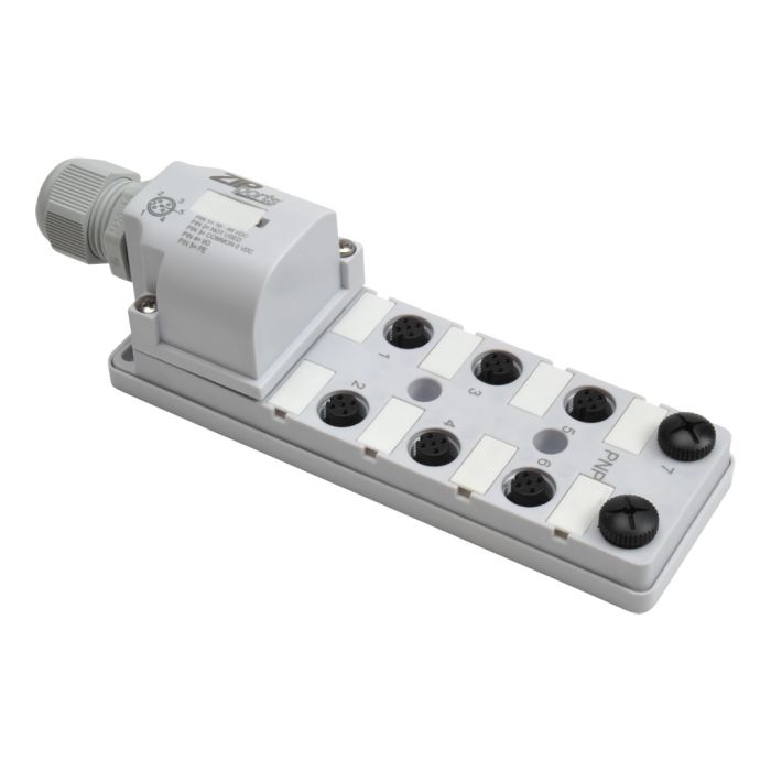 ZIPport junction block, 8 ports with M12 sockets rated 48 VDC max and 3 amps each, 4-pin with (1) I/O per socket, power and PNP LED , field wired connection.