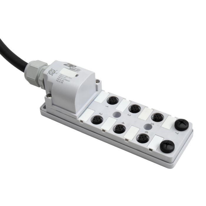 ZIPport junction block, 8 ports with M12 sockets rated 150 VAC/DC max and 3 amps each, 5-pin with (2) I/O per socket, no LED , 5-meter cable.