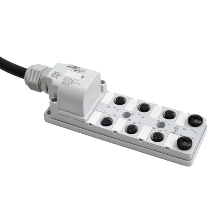 ZIPport junction block, 8 ports with M12 sockets rated 48 VDC max and 3 amps each, 5-pin with (2) I/O per socket, power and NPN LED , 5-meter cable.