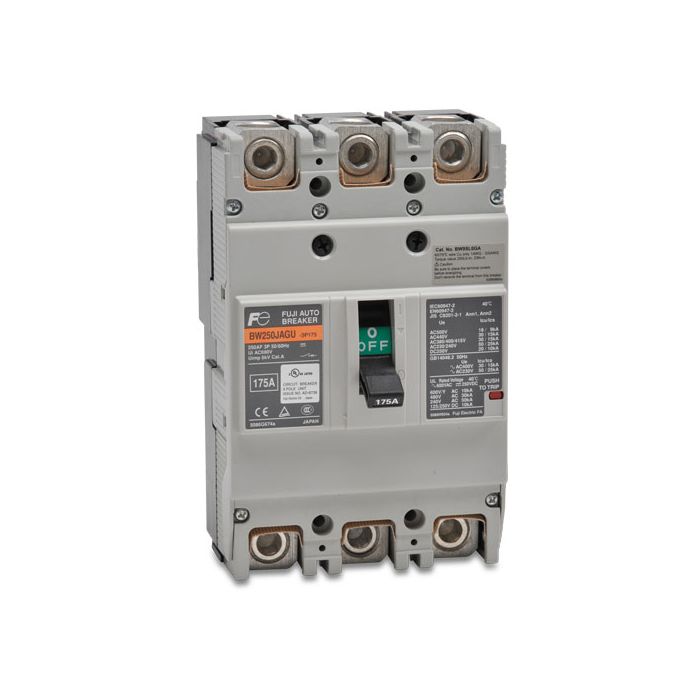 Molded Case Circuit Breaker, Fuji BW250 series, 250A frame, UL 489, 175A, 600VAC, 3-pole, thermal magnetic, panel mount. Includes line and load covers and lugs.