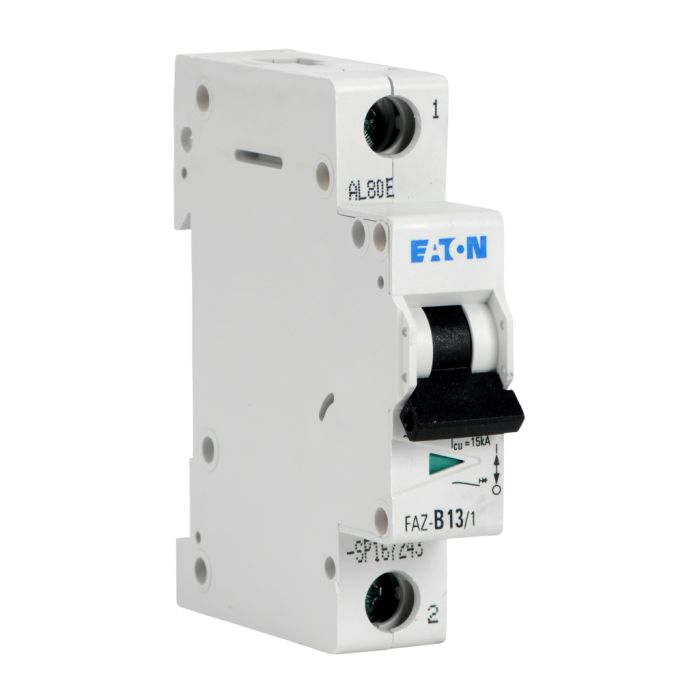 Eaton miniature supplementary protector, 13A, 277 VAC / 48 VDC, 1-pole, B curve, thermal magnetic, 10kA SCCR, 35mm DIN rail mount.
