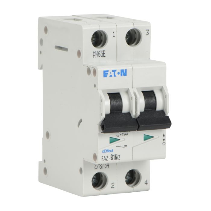 Eaton miniature supplementary protector, 16A, 480Y / 277 VAC / 96 VDC, 2-pole, B curve, thermal magnetic, 10kA SCCR, 35mm DIN rail mount.