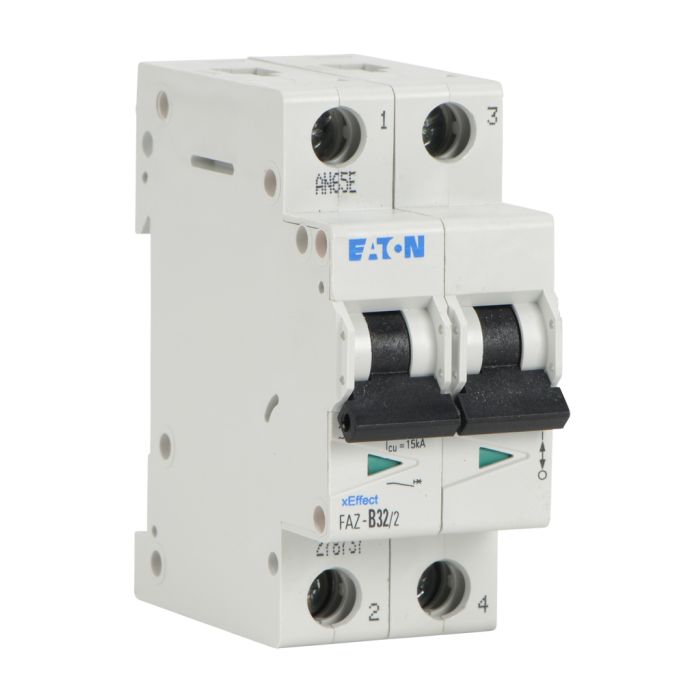 Eaton miniature supplementary protector, 32A, 480Y / 277 VAC / 96 VDC, 2-pole, B curve, thermal magnetic, 10kA SCCR, 35mm DIN rail mount.