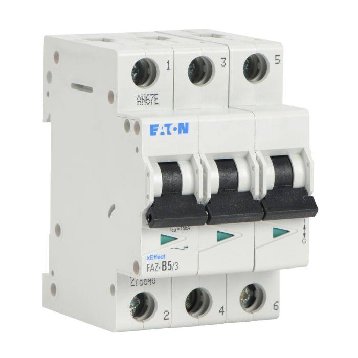 Eaton miniature supplementary protector, 5A, 480Y / 277 VAC / 96 VDC, 3-pole, B curve, thermal magnetic, 10kA SCCR, 35mm DIN rail mount.