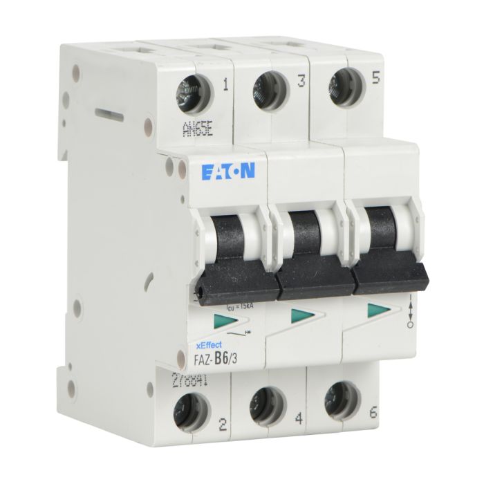Eaton miniature supplementary protector, 6A, 480Y / 277 VAC / 96 VDC, 3-pole, B curve, thermal magnetic, 10kA SCCR, 35mm DIN rail mount.