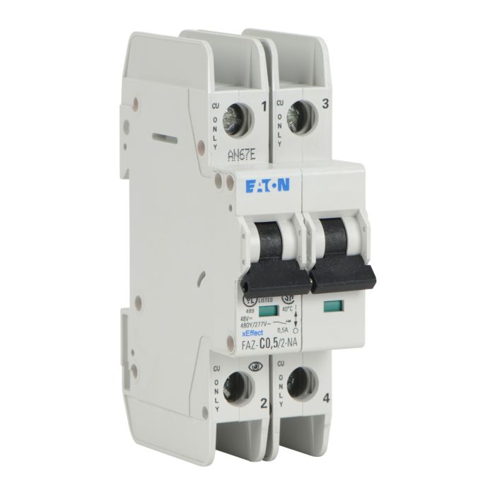 Eaton miniature circuit breaker, current-limiting, 0.5A, 480Y / 277 VAC / 96 VDC, 2-pole, C curve, thermal magnetic, 10kA SCCR, 35mm DIN rail mount.