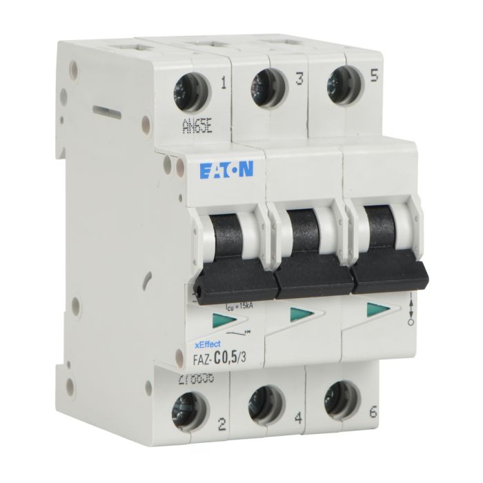 Eaton miniature supplementary protector, 0.5A, 480Y / 277 VAC / 96 VDC, 3-pole, C curve, thermal magnetic, 10kA SCCR, 35mm DIN rail mount.