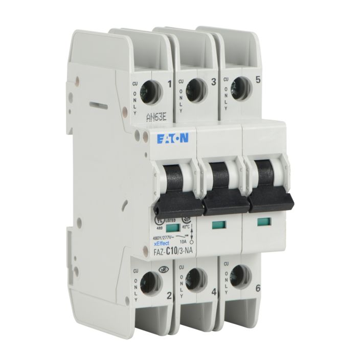 Eaton miniature circuit breaker, current-limiting, 10A, 480Y / 277 VAC / 96 VDC, 3-pole, C curve, thermal magnetic, 10kA SCCR, 35mm DIN rail mount.