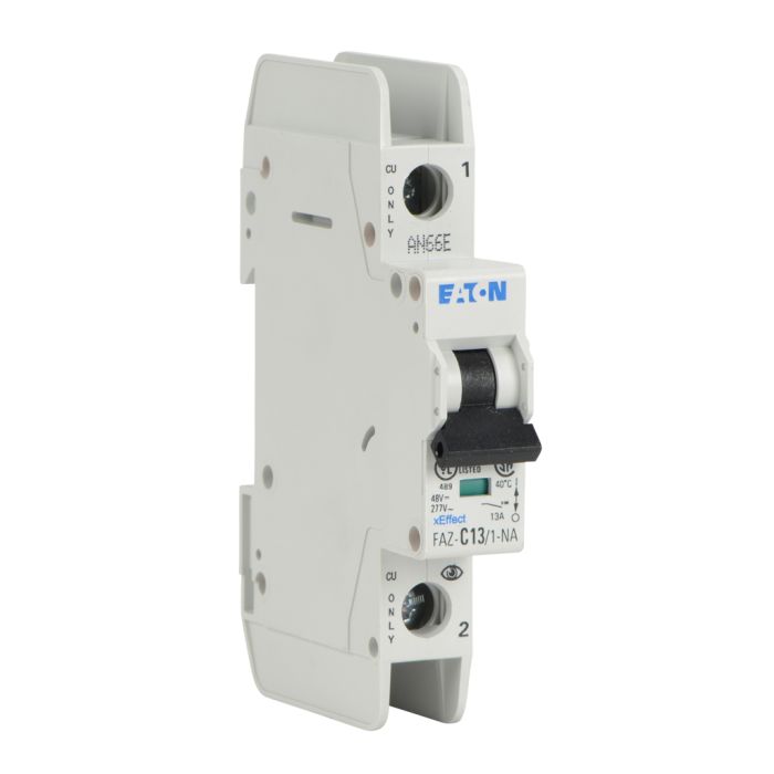Eaton miniature circuit breaker, current-limiting, 13A, 277 VAC / 48 VDC, 1-pole, C curve, thermal magnetic, 10kA SCCR, 35mm DIN rail mount.