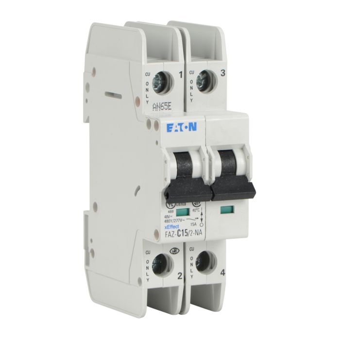 Eaton miniature circuit breaker, current-limiting, 15A, 480Y / 277 VAC / 96 VDC, 2-pole, C curve, thermal magnetic, 10kA SCCR, 35mm DIN rail mount.