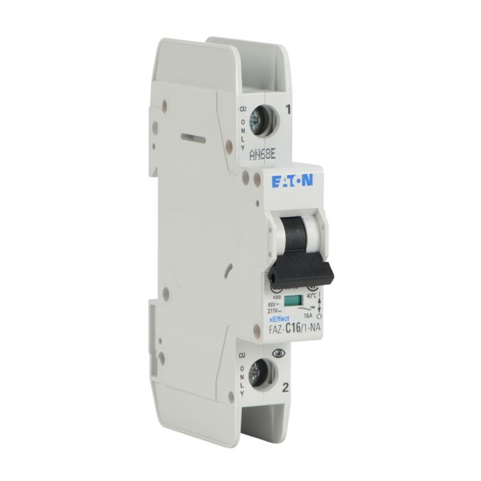 Eaton miniature circuit breaker, current-limiting, 16A, 277 VAC / 48 VDC, 1-pole, C curve, thermal magnetic, 10kA SCCR, 35mm DIN rail mount.