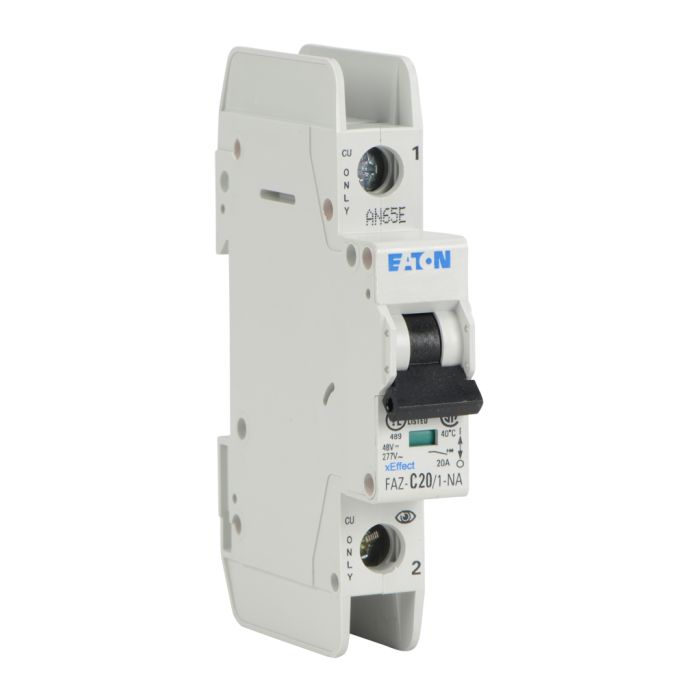 Eaton miniature circuit breaker, current-limiting, 20A, 277 VAC / 48 VDC, 1-pole, C curve, thermal magnetic, 10kA SCCR, 35mm DIN rail mount.