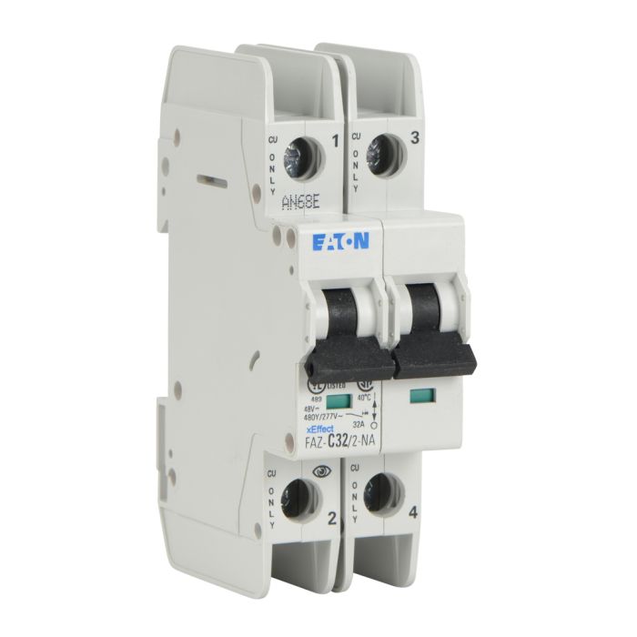 Eaton miniature circuit breaker, current-limiting, 32A, 480Y / 277 VAC / 96 VDC, 2-pole, C curve, thermal magnetic, 10kA SCCR, 35mm DIN rail mount.
